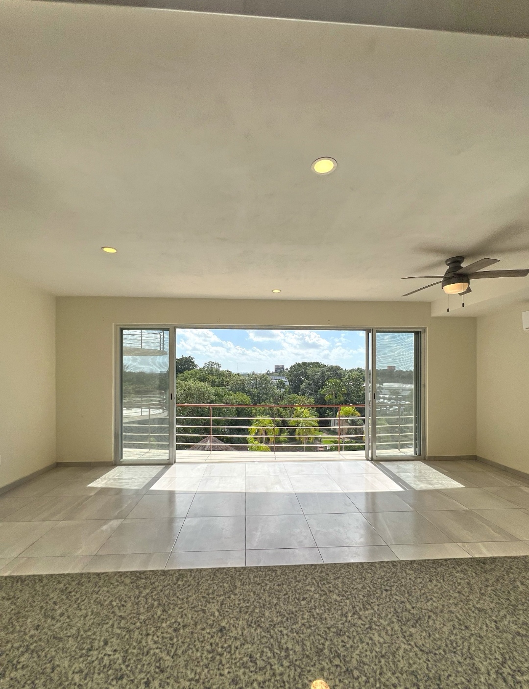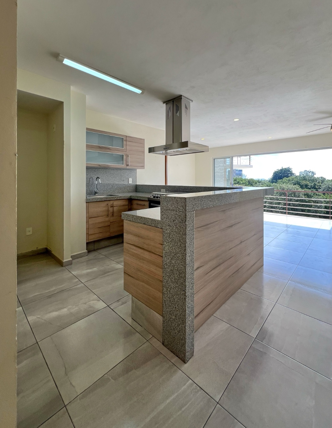 Area de sala y comedor con ventanal corredizo, cocina integral abierta equipada, barra de granito.